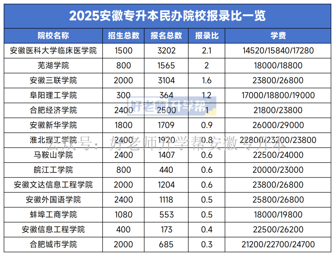 ?同樣,安徽信息工程學院、安徽外國語學院、蚌埠工商學院、安徽文達信息工程學院、皖江工學院的報錄比也都在0.6及以下。這些民辦院校由于辦學性質、學費等因素,報考熱度相對不高,但這也為一些備考時間不足,或者對沖刺公辦學校信心不足的同學提供了機會。