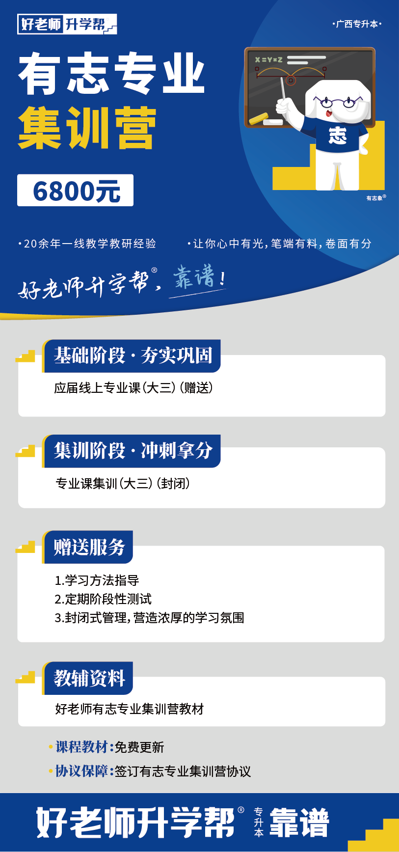 面授班 有志專業(yè)集訓(xùn)營(廣西分校) 適用對象:廣西地區(qū)在校大專生、統(tǒng)招專升本考生
