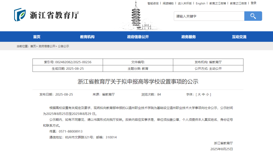導(dǎo)讀:8月25日,浙江省教育廳發(fā)布《關(guān)于擬申報(bào)高等學(xué)校設(shè)置事項(xiàng)的公示》,根據(jù)高校設(shè)置有關(guān)規(guī)定及要求,現(xiàn)將擬向教育部申報(bào)的以溫州職業(yè)技術(shù)學(xué)院為基礎(chǔ)設(shè)立溫州職業(yè)技術(shù)大學(xué)事項(xiàng)向社會(huì)公示。