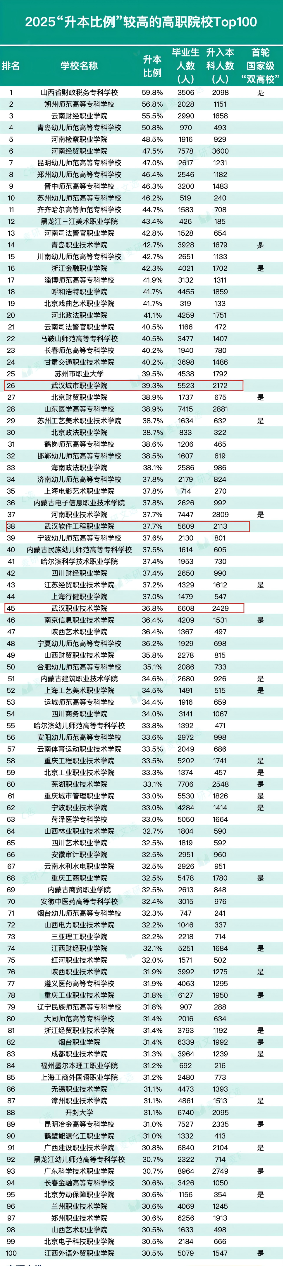其中,湖北共有3所院校上榜,一起來看看吧~ 全國前100名學(xué)校升本率均超過30.0%,湖北三所院校上榜分別是: ?武漢城市職業(yè)學(xué)院(升本率39.3%) ?武漢軟件工程職業(yè)學(xué)院(升本率37.7%) ?武漢職業(yè)技術(shù)學(xué)院(升本率36.8%)