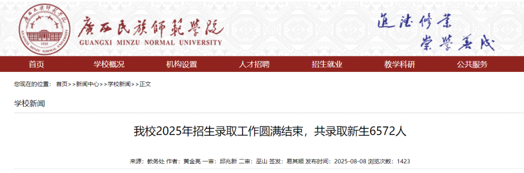 截至8月1日,我校2025年招生錄取工作圓滿結(jié)束,共錄取新生6572人,其中:普通本科5000人(含本科對口中職190人、2024年錄取預(yù)科升入本科169人)、專升本1400人、預(yù)科172人。普通本科、專升本、預(yù)科招生計(jì)劃完成率100%。
